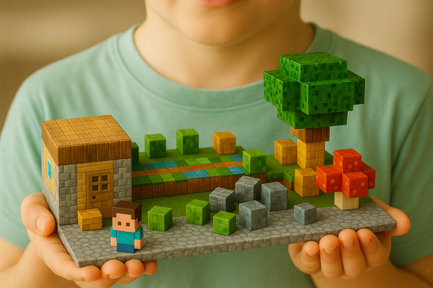 dzieci mówi:„To najlepsze klocki! Można budować domy, jaskinie, miecze i całe mapy jak w grze — mega zabawa!”